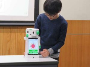 講座の最後には、自分が作ったプログラミングを発表し、こくりが道案内をしたり、自分の好きな早口言葉をしゃべらせたりと、皆さん素晴らしいプログラミングでした。2つの目標も達成できたので、認定書を受け取り、嬉しそうな笑顔を見せてくれました。講座を通して、プログラミングやロボットに興味を持ってもらえたと思います。