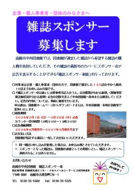 函館市中央図書館では、図書館が選定した雑誌から、希望する雑誌の購入費を負担していただき、その雑誌の最新号のカバーにスポンサー名や広告を表示することができる「雑誌スポンサー制度」を行っています。